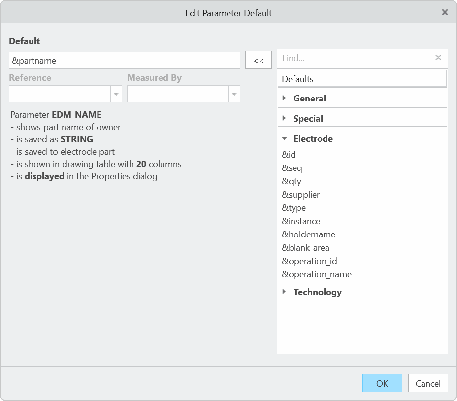 Applicable for COMPONENT. Measurements allow additional specification of destination (Reference) and origin (Measure By). Both references have to be named coordinate systems or system values. The syntax is &<default>:<(1)to reference>:<(2)from reference>. Electrode origin in end position and operation origin are used if no additional references are used: &<default>:ENDPOS:OP_ASM_REF_CSYS. The ‘from reference’ is used as projection reference.