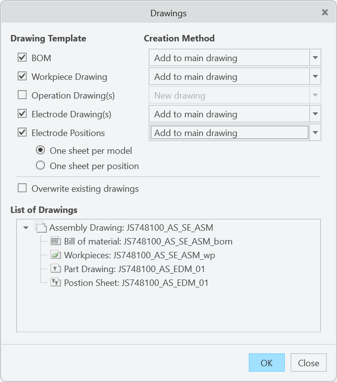 - Move views to electrode drawing — only for Electrode Position sheet. Drawing views will be added to electrode part drawing. Use this option to create a combined