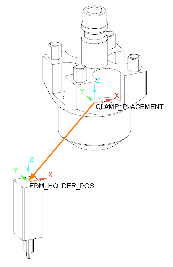 Imports from STEP/IGES will be assembled with origin on electrode coordinate system “EDM_HOLDER_POS”. Part files will be assembled with coordinate system “CLAMP_PLACEMENT” on electrode coordinate system “EDM_HOLDER_POS”.
